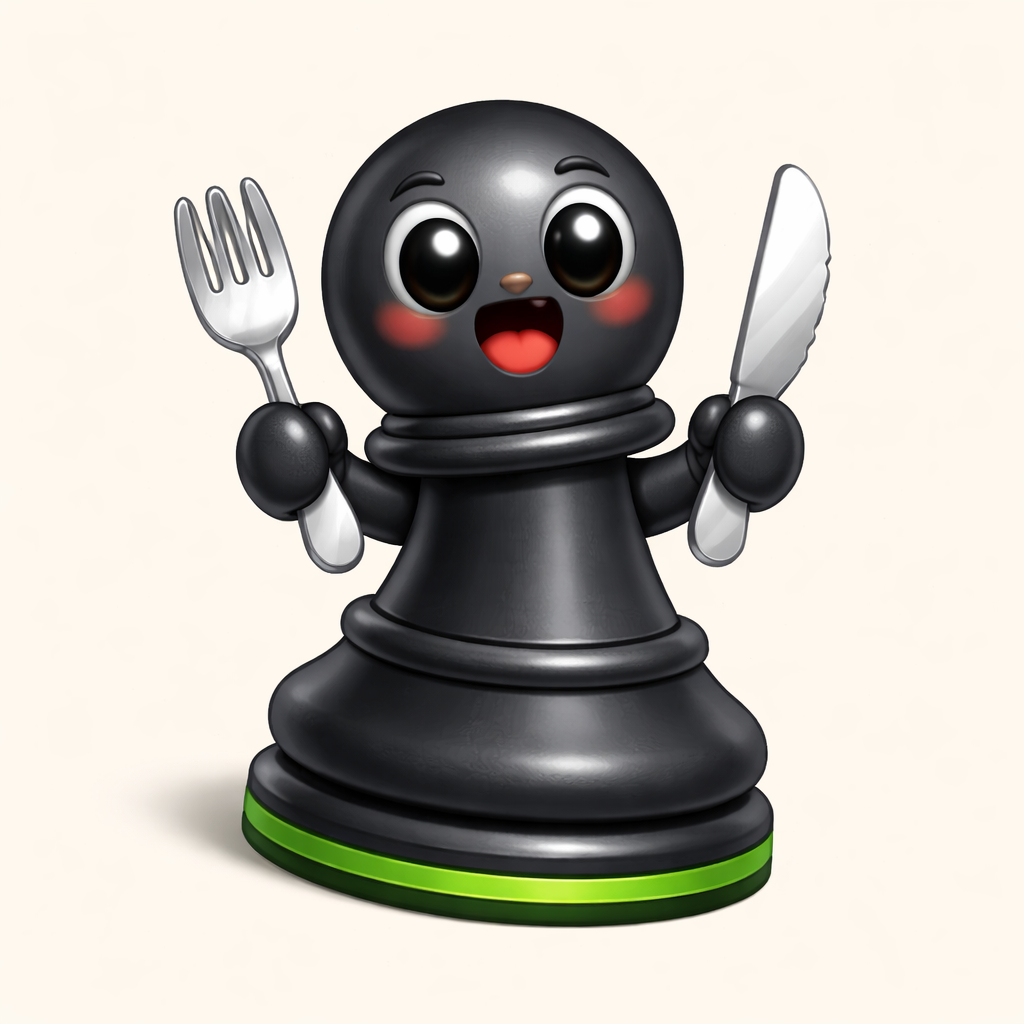 Every Eat Chess game keeps the board as the focal point and treats supporting UI as tactical annotations — warm wood, cream tablecloth, and a thin gold rim around the play surface. The same dining-table feel; different dishes.